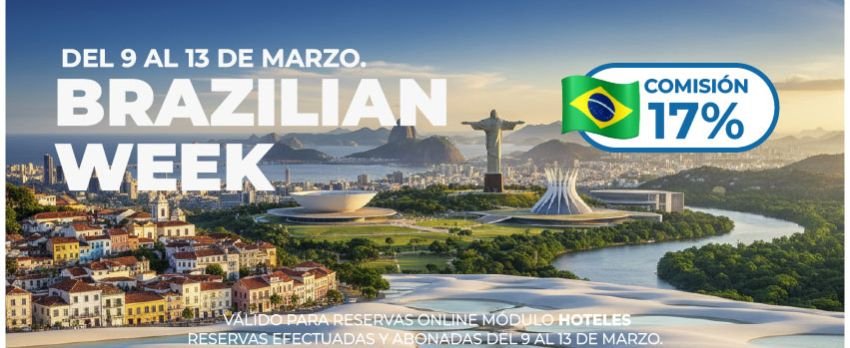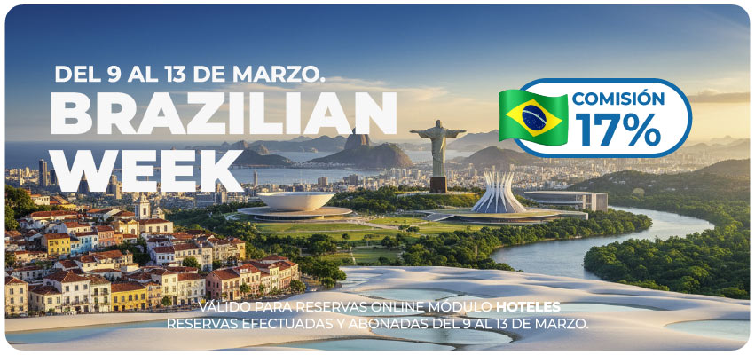 | Tatajuba Travel presenta una acción comercial exclusiva para agentes de viajes durante la Brazilian Week. Del 9 al 13 de marzo, todas las reservas online en el módulo hoteles para Brasil cuentan con comisión especial del 17%. Promoción válida para reservas confirmadas y abonadas dentro del período de la campaña. |
