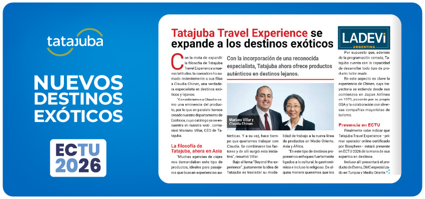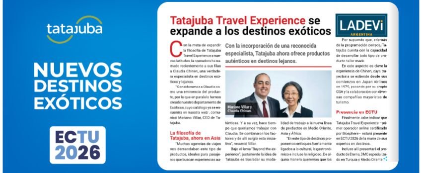 Tatajuba Travel continúa consolidando su posicionamiento en productos de larga distancia con una expansión estratégica hacia destinos exóticos. La compañía incorpora propuestas auténticas en Asia y destinos lejanos, fortaleciendo su portfolio para agentes de viajes con experiencias diferenciales. Esta evolución forma parte de su desarrollo comercial y fue destacada en una nota del sector turístico. |